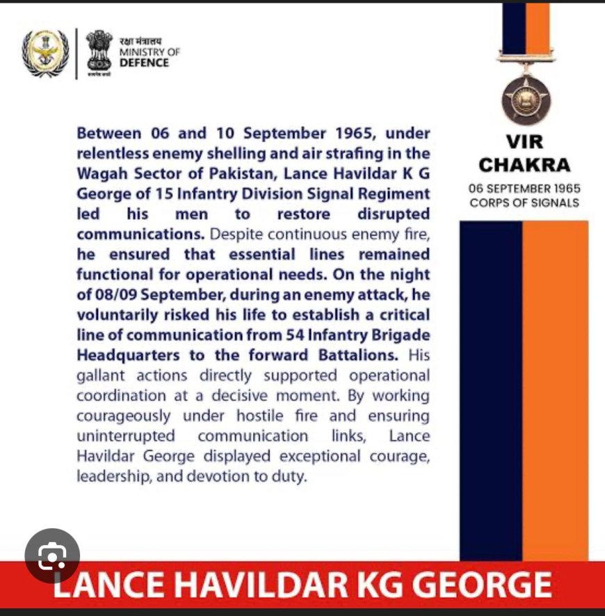 HAVILDAR K G George, a Vir Chakra awardee from the 1965 Indo-Pak war and the last living Vir Chakra recipient from the Corps of Signals, passed away on Saturday morning at his residence at Nedungadappally, Kottayam Dist. He was 95.