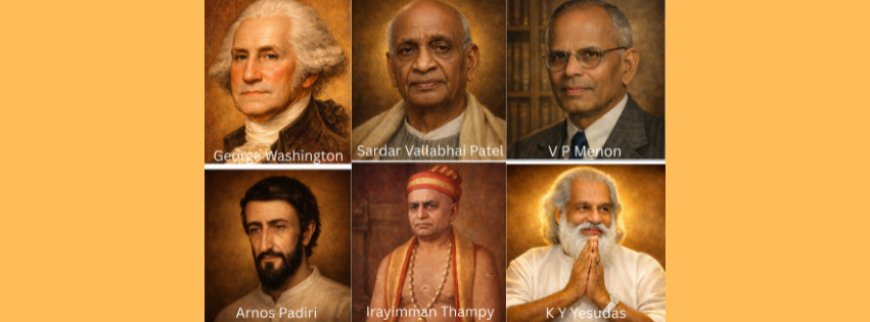ദുർബലമായ ഒരു റിപ്പബ്ലിക്കിനെ സ്ഥിരപ്പെടുത്തുകയും അധികാരം മനസ്സാക്ഷിക്ക് മുന്നിൽ വഴങ്ങണമെന്ന് തെളിയിക്കുകയും ചെയ്ത ജോർജ്ജ് വാഷിംഗ്ടൺ. വിഭജിത ഉപഭൂഖണ്ഡത്തെ ഒരൊറ്റ ജനാധിപത്യ രാഷ്ട്രമാക്കി ലയിപ്പിച്ച സർദാർ വല്ലഭായ് പട്ടേൽ. ചർച്ചകളിലൂടെയും ഭരണപരമായ മികവിലൂടെയും ഒരൊറ്റ ജനാധിപത്യ രാ ഷ്ട്രം എന്ന ദർശനത്തെ ഭരണഘടനാ യാഥാർത്ഥ്യമാക്കി മാറ്റിയ വി. പി. മേനോൻ. ഭാഷ, ഭക്തി, വിവിധ സാംസ്കാരിക രീതികളോടുള്ള ബഹുമാനം എന്നിവയിലൂടെ യൂറോപ്പിനും കേരളത്തിനും തമ്മിൽ പാലം കെട്ടിയ അർണോസ് പാതിരി. അനശ്വര ഗാന വരികളിലൂടെ രാജ കൊട്ടാരങ്ങളിലെയും സാധാരണരുടെ ഭവനങ്ങ ളിലെയും , ദൈനംദിന ജീവിത വികാരങ്ങളെ ക്ലാസിക്കൽ കലയുടെ അലകളിലൂടെ സമഷ്ടീഭവിപ്പിച്ച ഇരയിമ്മൻ തമ്പി. മതം, ഭാഷ, ഭൂമിശാസ്ത്രം എന്നിവയുടെ അതിരുകളെ നാദധാരയിലൂടെ അലിയിച്ചു കളഞ്ഞ്, ഇന്ത്യയുടെയും കേരളത്തിൻ്റെയും ആത്മാവിനെ ആഗോള മാനവ സമൂഹത്തിലേക്ക് വിടർത്തിക്കൊണ്ടുപോകുന്ന കെ. ജെ. യേശുദാസ്.