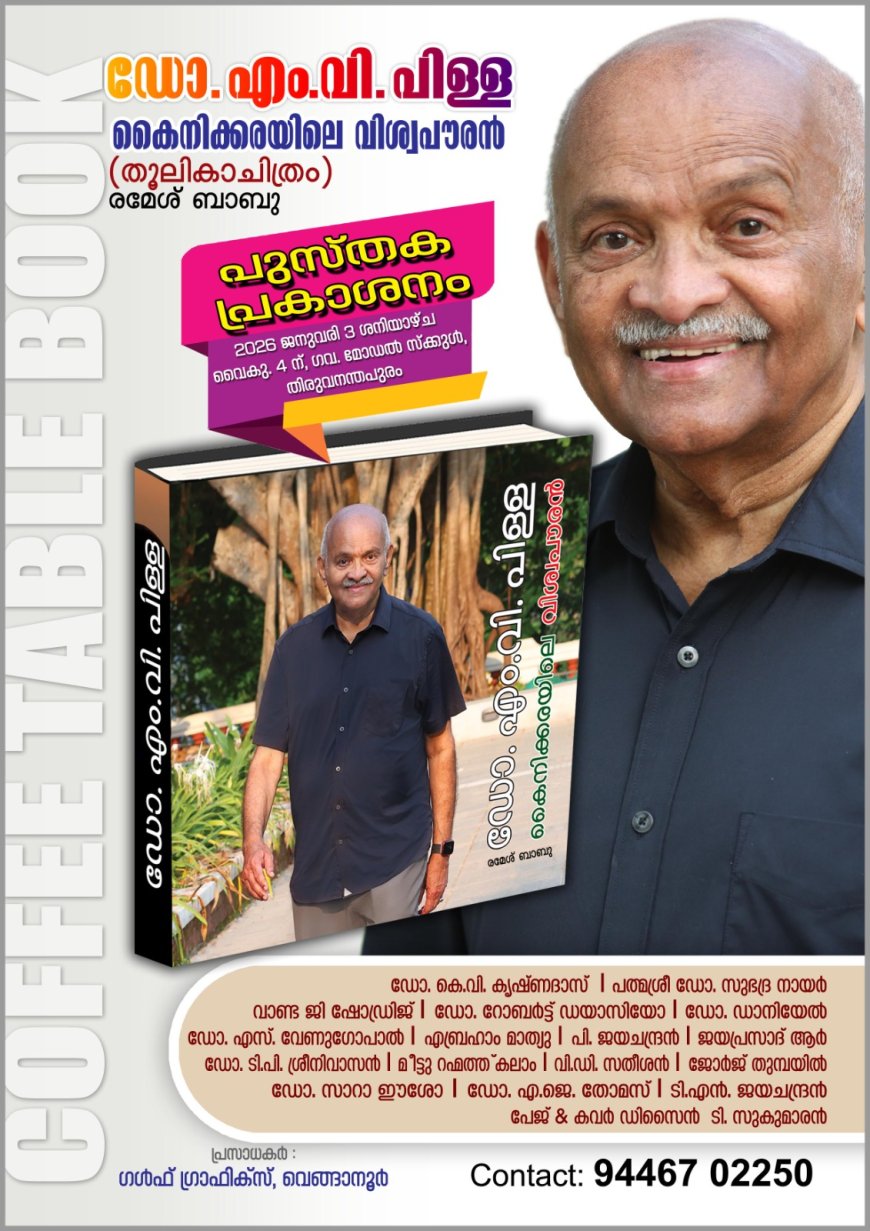 ഡോ.എം.വി.പിള്ള കൈനിക്കരയിലെ വിശ്വപൗരന്'': പുസ്തക പ്രകാശനം ജനുവരി 3 ശനിയാഴ്ച്ച തിരുവനന്തപുരം ഗവണ്മെന്റ് മോഡല് സ്കൂളില്