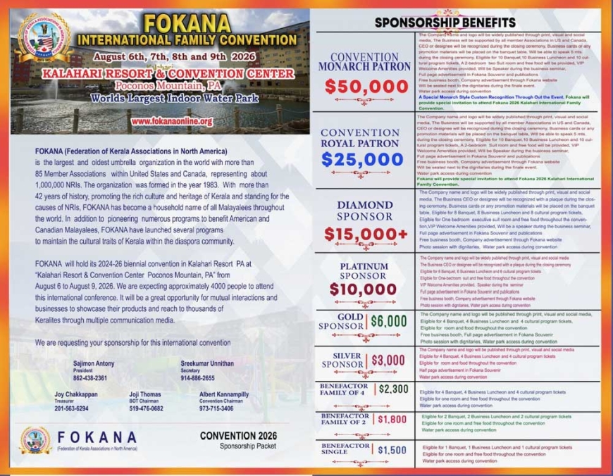 ഫൊക്കാനാ ഇന്റർനാഷണൽ കൺവെൻഷൻ ഓഗസ്റ്റ് 6 മുതൽ 9 വരെ പെൻസിൽവേനിയയിലെ മനോഹരമായ പോക്കനോസ് മൗണ്ടൻസിലെ കൽഹാരി റിസോർട്ടിൽ നടക്കുമ്പോൾ അത് ഫൊക്കാനയുടെയും മറ്റ് ഏത് പ്രവാസി സംഘടനകളുടെയും ചരിത്രത്തിൽ ഇന്നുവരെ വരെ കണ്ടിട്ടില്ലാത്ത ഒരു കൺവെൻഷനാണ് സാക്ഷിയാകുവാൻ പോകുന്നത് . ഇത് ഫൊക്കാനയുടെ ചരിത്രത്തിൽ സുവർണ്ണ നിമിഷം തന്നെയാണ്.