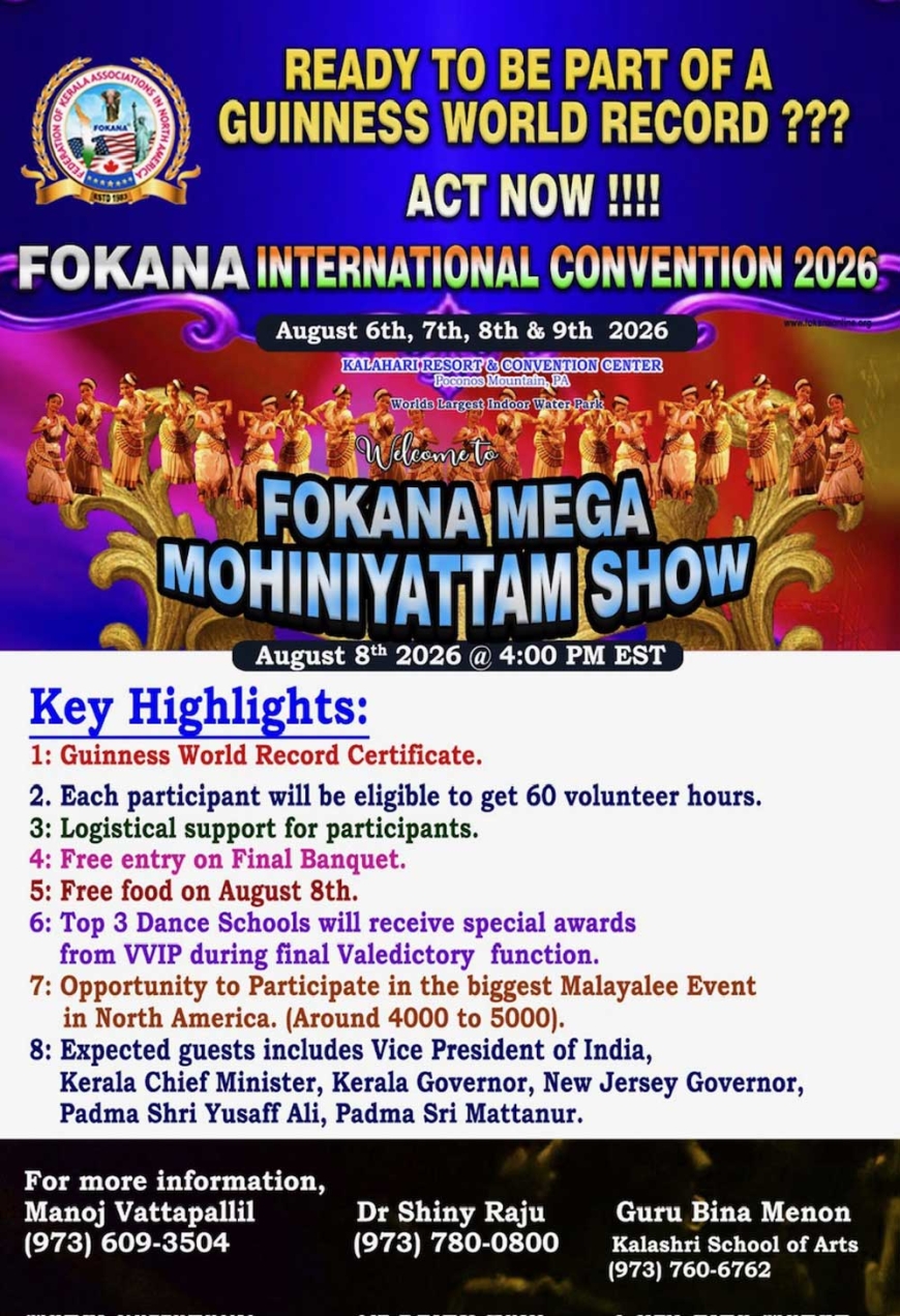 ന്യൂ യോർക്ക് : മോഹിനിയാട്ടത്തിൽ വേൾഡ് ഗിന്നസ് ചരിത്രത്തിന്റെ ഭാഗമാകാൻ ഫോക്കാന ഒരുക്കുന്ന അപൂർവ്വ അവസരം ഫൊക്കാന കൺവെൻഷനിൽ. കേരളത്തിന്റെ തനത് ലാസ്യനൃത്തകലാരൂപമാണ് മോഹിനിയാട്ടം, ആ നാട്യശാസ്ത്രത്തിൽ അമേരിക്കയിൽ ഒരു ഗിന്നസ് വേൾഡ് റെക്കോർഡ് നേടുവാൻ ഫൊക്കാന ഇന്ത്യൻഅമേരിക്കൻ ഡാൻസേസിന് അവസരം ഒരുക്കുന്നു. നോർത്ത് അമേരിക്കയിൽ മോഹിനിയാട്ടം കളിക്കുകയും പഠിക്കുകയും ചെയ്യുന്ന ഡാൻസേസിന് കിട്ടുന്ന അസുലഭ സന്ദർഭമാണ് ഫൊക്കാന ഒരുക്കുന്നത്.