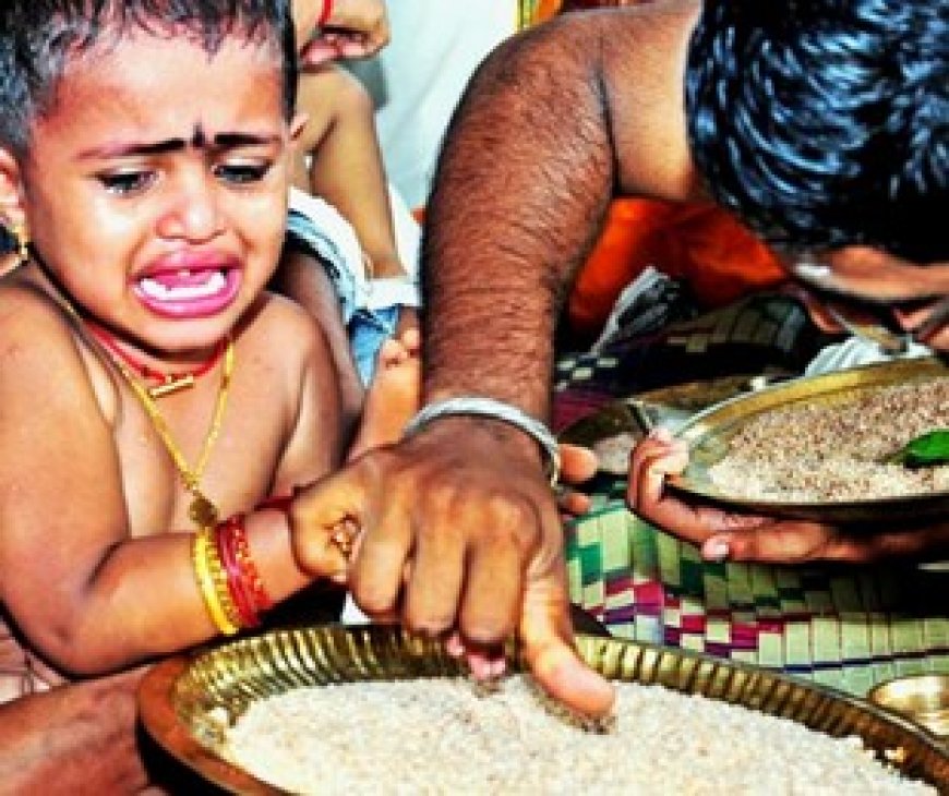 Following tradition, the guru uses a golden ring to write sacred words on the child's tongue: Hindu children begin with "Hari Sree Ganapathaye Namaha", while Christian children inscribe "Sree Yesu Mishihaye Namaha."